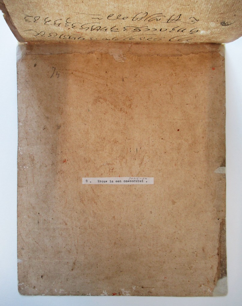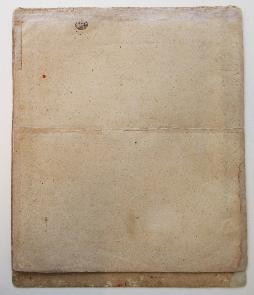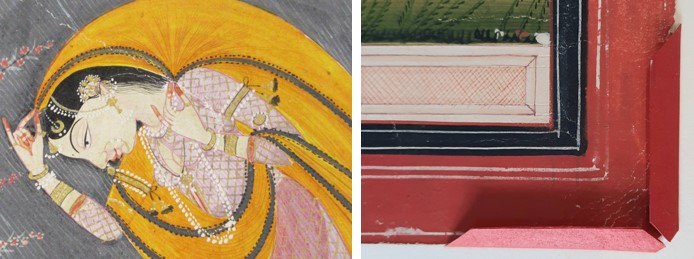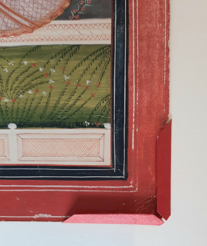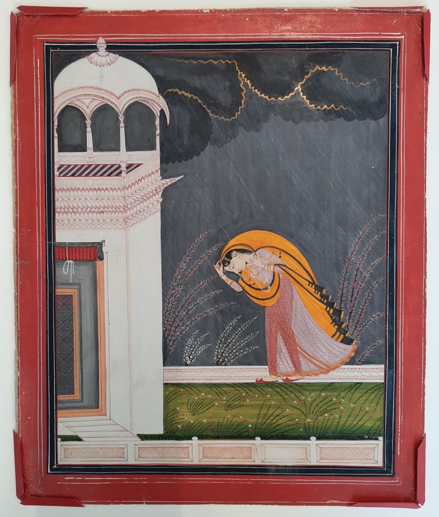 The project on the Pahari works of the Museum Volkenkunde is going well. I am currently mounting the 134 paintings and drawings using methods tailored to the requirements of each folio.This beautiful painting of Virahini Nayika (longing heroine) braving the storm was executed on a thick board, called vasli, made of a lamination of sheets pasted on top of the other. In addition, a dust-cover was adhered along the upper edge, to protect the work from wear and light.