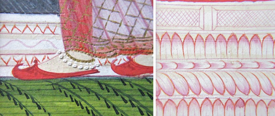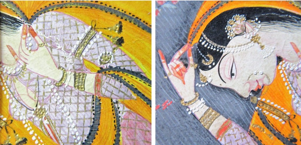 For your viewing pleasure, more close-ups of the painting: The gold paint was needle-punched to reflect the light and the jewels were made with droplets of white paint to give relief to the composition. The hands are dyed with henna.