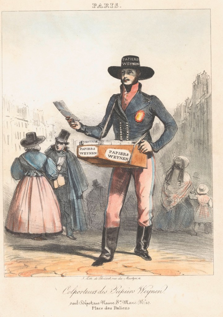 Yesterday I came across some images of street vendors and book peedlers selling paper products. Not all merchants could afford to have a shop and from the Middle Ages onwards, itinerant merchants sold their wares in the towns but also roamed the countryside on foot.