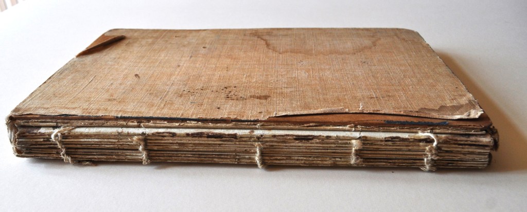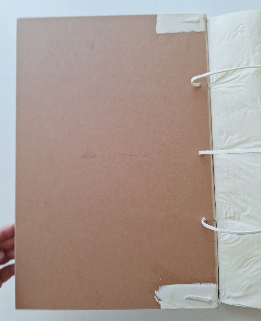 Upon it arrival at the centre, the volume was very damaged. The boards were detached from the text block. The cloth covering was dirty, stained and worn. The sewing was broken and many leaves were detached. The endbands and spine were missing.