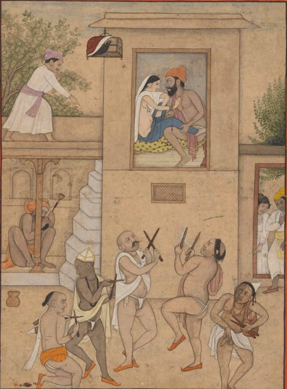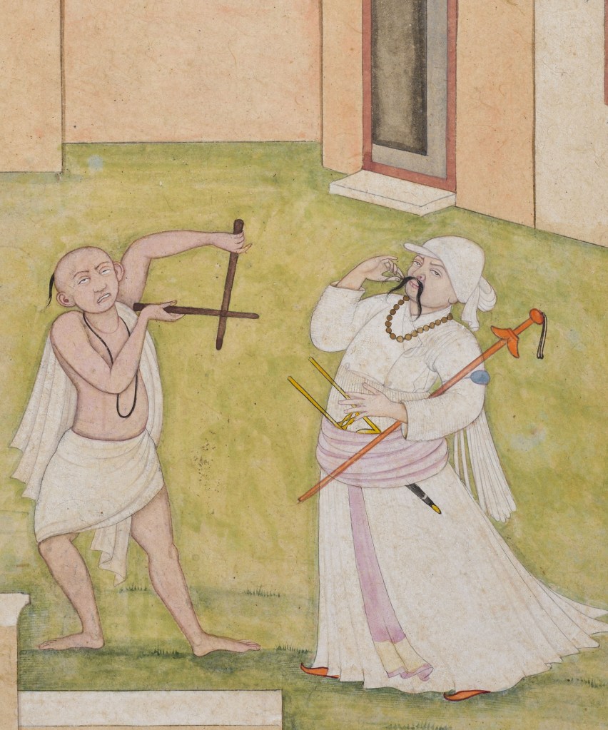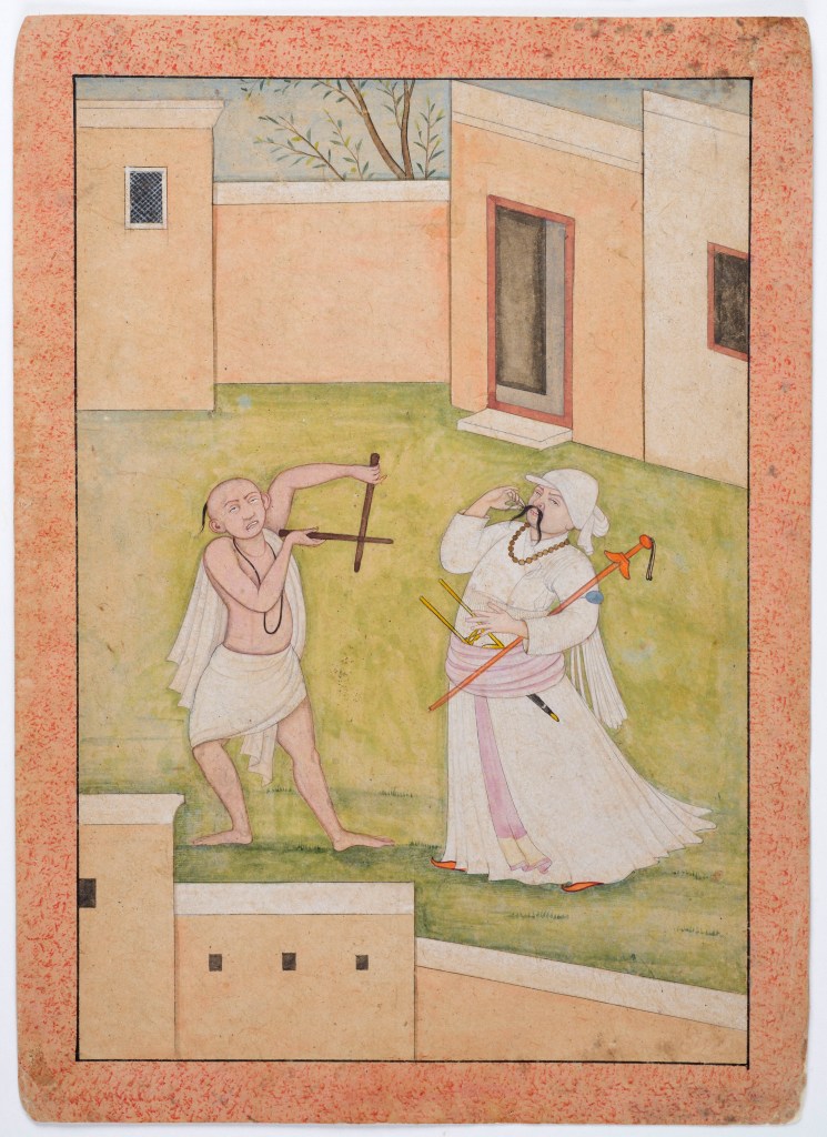 Therefore, the painting shows a theatrical artist in the guise of a Suthrasahi ascetic, equipped with clapping sticks, mocking a dandy in full regalia who is a caricature of an English military officer. Especially the latter is funny: His long mustache is from horse hair and fixed temporarily over his lip, his belly is probably stuffed with a cushion and besides a dagger, he holds a lacquered stick and sports a tropical helmet to which a turban cloth is attached — both insignia of a British official. The fine painted details, such as the realistic facial features, bear witness to the skill of the artist, who was undoubtedly a close relative of Nainsukh.