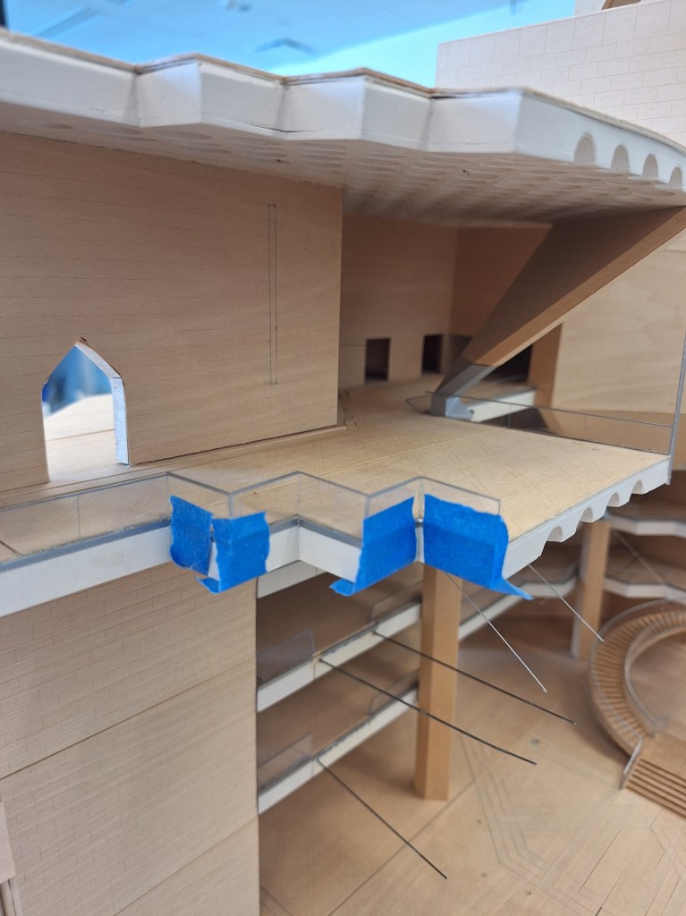 The model is in poor condition due to inadequate conservation and storage conditions until its transfer to Qatar. It has suffered damage from water, climatic fluctuations and exposure to dust. As a result, many parts are unstable, broken, deformed, loose, detached or lost. In particular, the chandelier and the long glass window composed of six separate parts have fallen off. In addition, one of the tallest columns was missing, as were the bridge and the top of the entrance canopy.